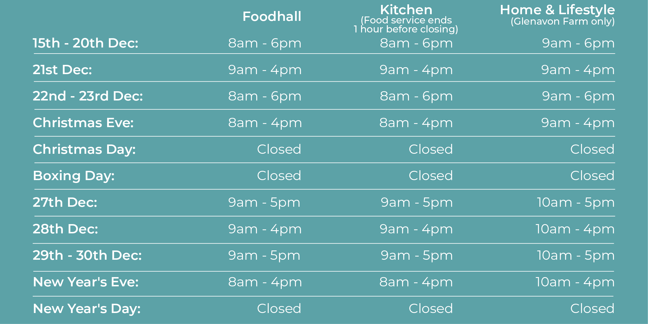 Pop into the kitchen and enjoy a warming mulled wine by our cosy log burner and visit our Home & Lifestyle shop at Glenavon Farm for beautiful gifts and craft workshops.